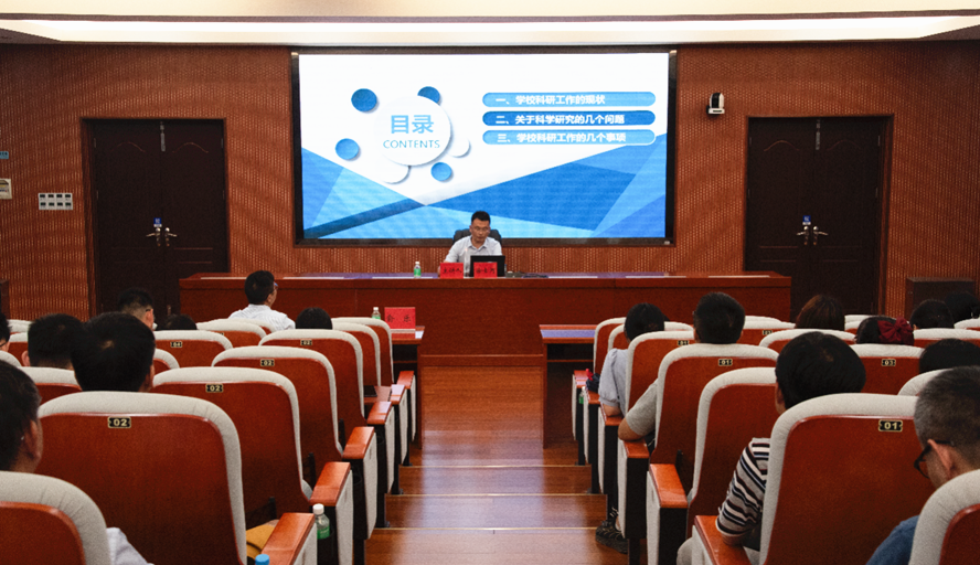 在科研专题讲座上,徐士河围绕学校科研工作现状、科研选题原则及过程、申报科研项目注意事项和学术论文发表等内容展开介绍。他强调科学研究是学校发展、教师自我提升、教师队伍专业化建设的重要途径,并对新入职教职工提出建议:一是转变观念,培养关注科研、终身学习、长远努力、跟上时代的科研意识;二是付诸行动,从主持项目、加入团队、参与平台、获得成果逐渐深入。