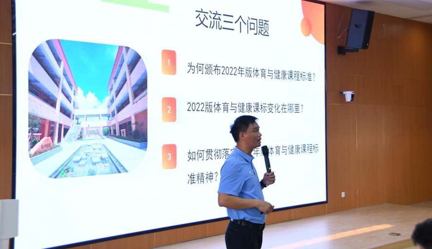 本网讯 11月24日,体育与健康学院邀请2006届校友、中山市小学体育与健康学科中心教研组组长、中山市东区朗晴小学总务副主任温刘军为学院师生带来讲座《新课标背景下的中小学体育课程的教学设计》。正处级辅导员唐运刚主持。